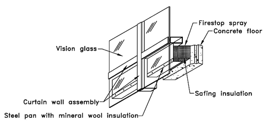 | 715.4 Exterior curtain wall/fire-resistance-rated floor intersections. Voids created at the intersection of exterior curtain wall assemblies and fire-resistance-rated floor or floor/ceiling assemblies shall be protected with an approved perimeter fire containment system to prevent the interior spread of fire. Such systems shall provide an F Rating for a time period not less than the fire-resistance rating of the floor or floor/ceiling assembly. 715.4.1 Fire test criteria. Perimeter fire containment systems shall be tested in accordance with the requirements of ASTM E2307. Exception: Voids created at the intersection of the exterior curtain wall assemblies and floor assemblies where the vision glass extends to the finished floor level shall be permitted to be protected with an approved material to prevent the interior spread of fire. Such material shall be securely installed and capable of preventing the passage of flame and hot gases sufficient to ignite cotton waste where subjected to ASTM E119 time-temperature fire conditions under a minimum positive pressure differential of 0.01 inch (0.254 mm) of water column (2.5 Pa) for the time period not less than the fire-resistance rating of the floor assembly. Extracted from 2021 International Building Code® (IBC) |