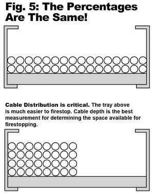 The intumescent material must be installed in a way that permits it to push in and compress the cable bundle. Looking at the cable trays in Figure 5, while the loading percentages are identical, the cable tray on the top will require less compression than the cable tray on the bottom. Thus it will be easier and safer to firestop. When it comes to firestopping,