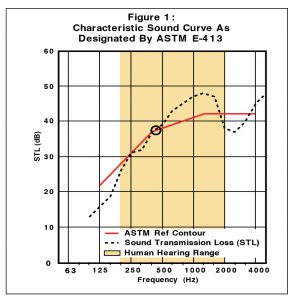 The overall performance of an assembly is rated by the Sound Transmission Coefficient (STC). This rating incorporates the above criterion applied across 16 one-third-octave bands within the frequency range of 100 and 5000 Hz. Results generated within the range of 125-4000 Hz are fitted to a characteristic sound curve as designated by ASTM E413 (see Figure One) from which an STC rating is generated. The test method described by ASTM E90 incorporates two rooms that are divided by a separating partition. The specimen to be examined (in our case is a typical gypsum wallboard assembly) is installed within the separating