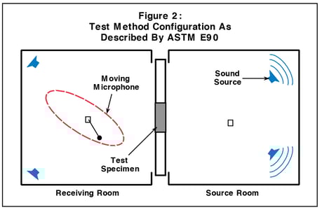 partition as indicated by Figure Two. The rooms, one called the source room and the other the receiving room, are constructed using techniques that ensure sound transmission occurs only through the test specimen. The source emits sounds, in each of 16 one-third-octave bands ranging from 100 to 5000 Hz, that travel through the test partition and is detected by the receiver. Reverberation is also analyzed and noted within the source room. In this way, sound decay is measured and by determining STL ratings and the STC rating is