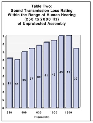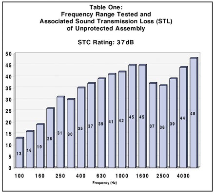 STL rating is a measure of how the sound level is reduced for the specific frequency tested. Table Four indicates that the overall STL rating was increased by two decibels between 315 Hz and 500 Hz, four decibels between 630 Hz and 800 Hz, five decibels at 1000 Hz, three decibels at 1250 Hz, 2 decibels at 1600 Hz, and 1 decibels at 2000 Hz.